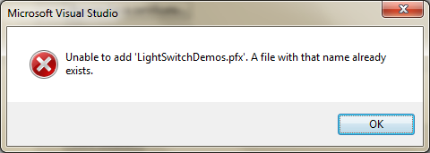 - Si intentamos seleccionar el mismo certificado (.pfx) selecionado previamente en pasos anteriores, encontrearemos este otro error “Unable to add ‘<XapCertifie>.pfx’. A file with than name alread exists ”: