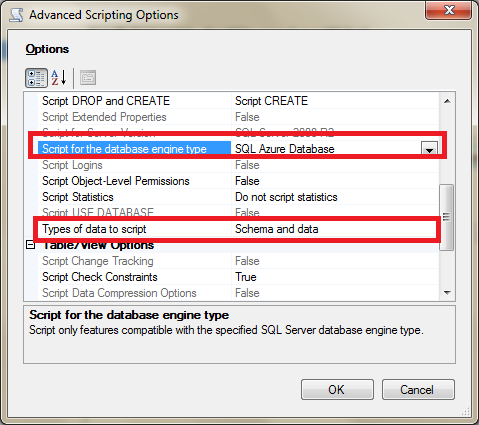 - Haciendo uso de la herramienta de exportación de Scripts de SQL Server 2008 “Generate Scripts…” (Seleccionar en este caso). En este caso ten en cuenta dos propiedades ”avanzadas” importantes: “Script for the database engine Type” y “Types of data to scripts” (Para este caso no es importante, pero será necesario tenerlo en cuenta a la hora de crear BBDD con datos). Una vez generado el Script crear una coneción con el servidor de SQL Azure para la BBDD creada durante los pasos anteriores, y ejecutar este scripts.