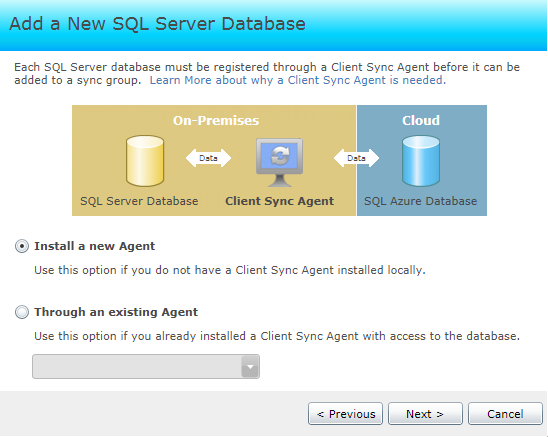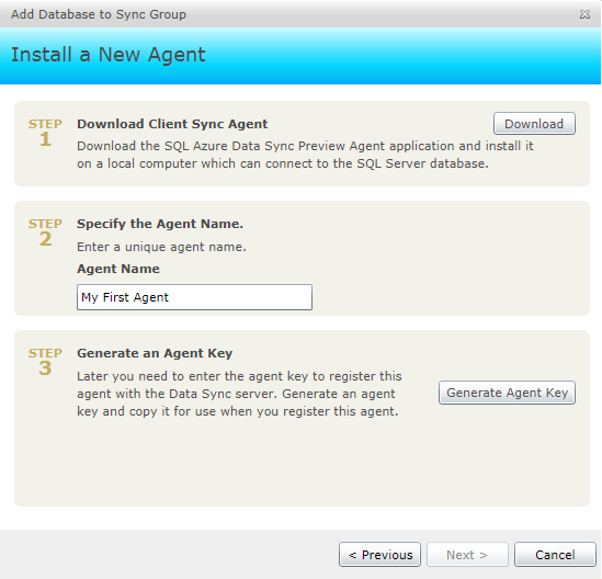 - La primera vez que ejecutes este paso (2) necesitarás instalar en local el software “Client Sync Agent”, de manera que este permitirá al Portal de Azure configurar las sincronizaciones conociendo así las conexiones SQL Server locales. Para completar este paso por primera vez sigue estas indicaciones: