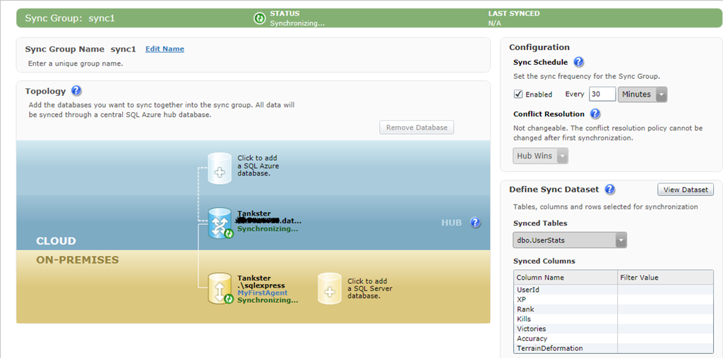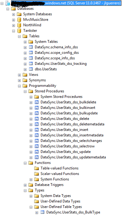 Una vez finalizado el proceso las BBDD, tanto la local como la SQL Azure, incluirán un mayor numero de objetos; tablas, procedimientos almacenados y tipos definidos por el usuario, todos ellos con el prefijo “DataSync.”