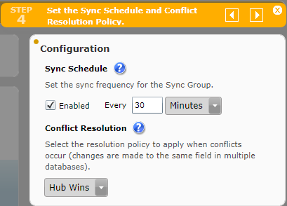 Paso 4: Indicar cada cuanto tiempo queremos que se ejecute la sincronización, si queremos o no habilitar el proceso de sincronización y la política de conflictos (que información prevalece ante un conflicto, la de SQL Azure (Hub) o SQL Server Local (Client)),