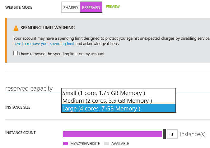 - SCALE: Esta es la opción más importante, donde podremos optar a hacer que nuestro Web Site sea “Shared” o “Reservado” (Multitenant o no), de manera que nuestro site compartirá recursos con otros o no respectivamente. Al cambiar esta opción, tenemos que tener cuidado de no sobrepasar los límites de nuestra subscripción, principalmente si estamos probando y no queremos pagar más de lo necesario. En cualquier caso, siempe serémos avisados con el pertinente mensaje “SPENDING LIMIT WARNING”. Al sobrepasar dicho límite podremos optar por dotar a nuestra aplicación de un escalado vertical (“Scale UP”) y en cualquier caso, tanto sobrepasando este límite como si no, siempre podremos optar, adiconalmente, por un escalado horizontal (“Scale Out”) hasta un máximo de tres instancias. ¡Parecen pocas por el momento, supongo que tendremos la opción de poder incrementar más este número en un futúro no muy lejano!