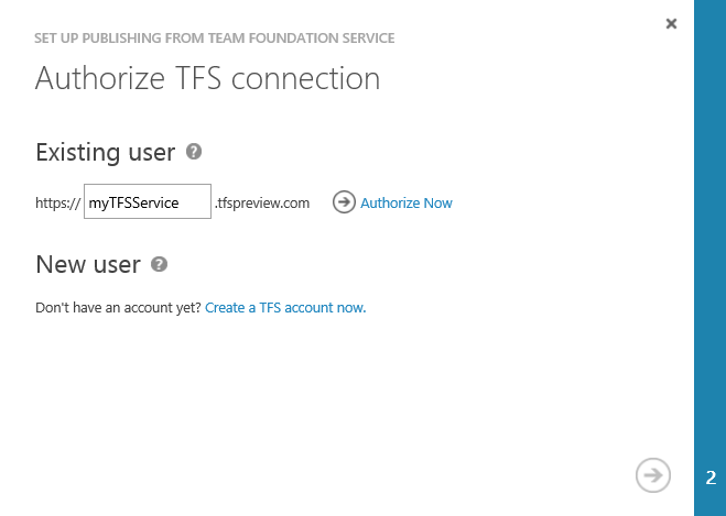 - Introduce el nombre del TFS “Service Preview”. Nota: Para crear tu “TFS Service”, sigue estos pasos.