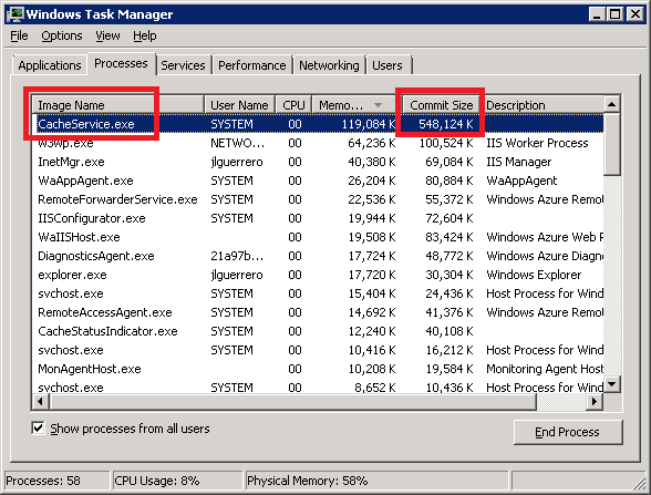 Adcicionalmente, podemos comprobar la memoria dedicada a la Caché Co-located, cuyo valor ronda los 530MB iniciales aproximadamente, valor indicado por el proceso “CacheService.exe” y que se corresponde con el 30% establecido en las propiedades del proyecto de tipo Cloud.