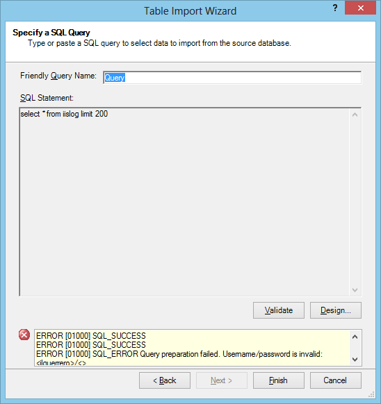 7.a) En este punto obtendremos un error del tipo, “SQL_ERROR Query preparation failed. Username/password is invalid: <jlguerrero>/<>”. Donde por algún motivo el passord no se incluye en la conexión ni tampoco hay posibilidad para ello.