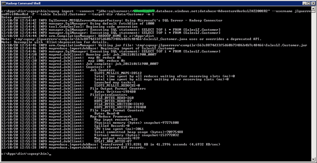 3) Desde la consola de comandos de Hadoop (Hadoop Command Shell) navegamos hasta la ruta concreta “c:\Apps\dist\sqoop\bin” y ejecutamos la siguiente instrucción para realizar la importación de la tabla SalesLT.Customer al sistema de ficheros de Hadoop (HDFS) concretamente a la ruta /data/customer.