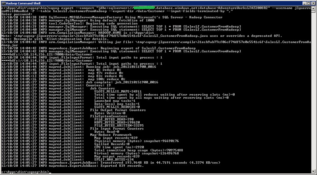 2) Veamos a continuación como exportar desde Hadoop (HDFS) hacia SQL Azure: