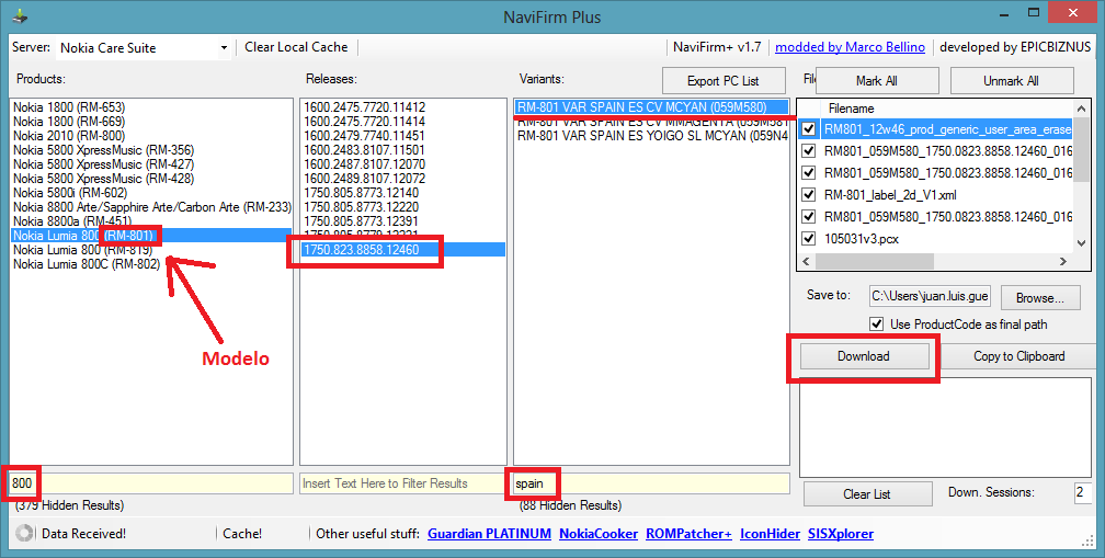 2) Desde NaviFirm, descargar el Software adecuado según el teléfono y según los pasos que pueden verse en la siguiente imagen. El primero dato a indicar es el modelo del Nokia.