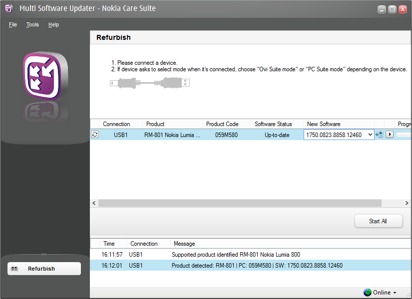 6) Desde “Nokia Care Suite” acceder a “Multi Sofware Updater” y comenzar con “Refurbish” . Es importante saber que esta acción eliminará cualquier dato almacenado en el dispositivo/teléfono, así que previamente será necesario hacer el backup correspondiente.