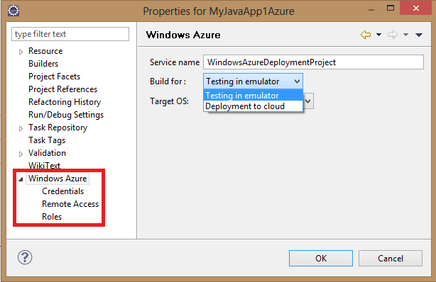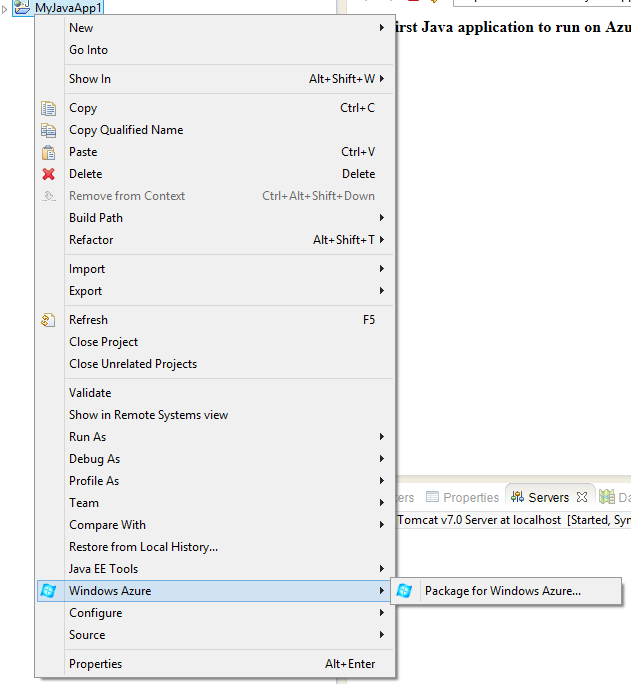 11) Creamos el proyecto de despliegue en Windows Azure. Aunque podemos hacerlos desde la opción de menú: “File > New > Windows Azure Deployment Project”, lo haremos más rápido haciendo “click derecho” sobre el proyecto Java “MyJavaApp1” y ”Windows Azure > Package for Windows Azure….” e introduciendo el nombre “MyJavaApp1Azure”. Seguidamente indicamos la información de nuestro JDK de Java y Servidor Tomcat y “Finish”.