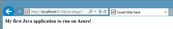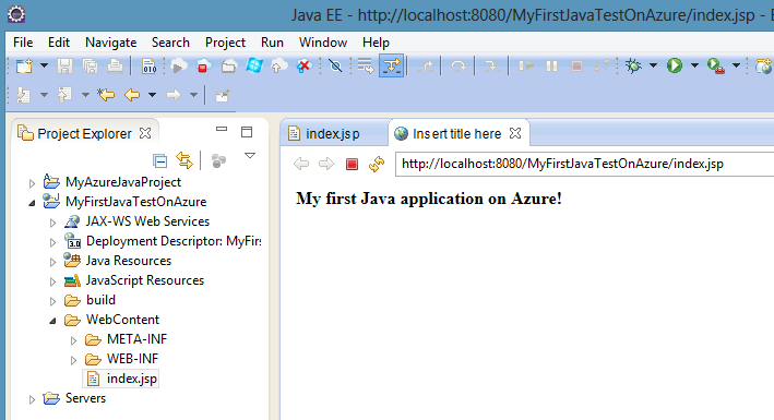9) Añadimos a este fichero, a modo de ejemplo, en el tag <body> la instrucción “<b><% out.println("My first Java application to run on Azure!"); %></b>”.