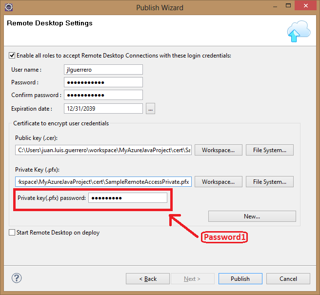 Nota: ¡Aunque he dejado el password del certificado por defecto, Password1, las credenciales de conexión remota las he modificado a mi antojo!.