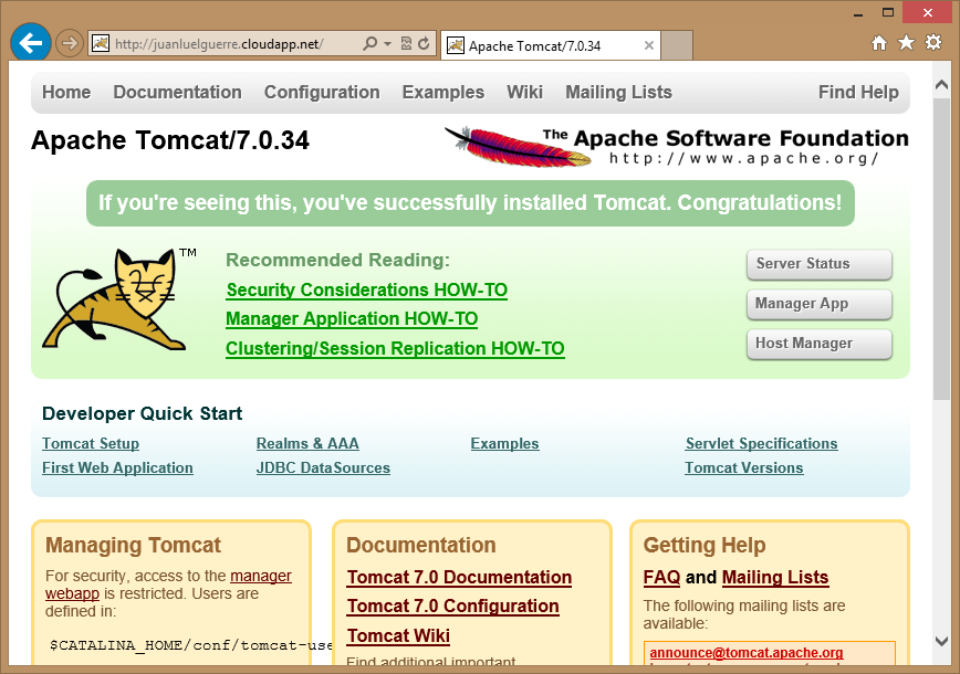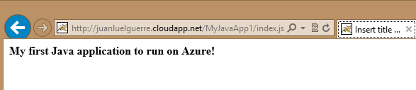 15) Esperamos a que finalice el proceso de subida de los ficheros al Storage de Azure y el despliegue, y tras ello, al acceder a la url “http://juanluelguerre.cloudapp.net/”, podremos ver como el Servidor Apache Tomcat ha sido instalado. Si a la misma añadimos la ruta de nuestra aplicación, “http://juanluelguerre.cloudapp.net/MyJavaApp1/index.jsp”, Voilá, tenemos nuestra aplicación Java ejecutándose en Azure !!!