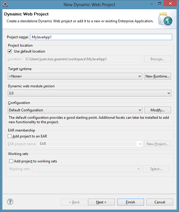 7) Desde Eclipse, creamos un proyecto “File > New > “Dinamic Web Project” con el nombre “MyJavaApp1” y pulsamos “Finish”