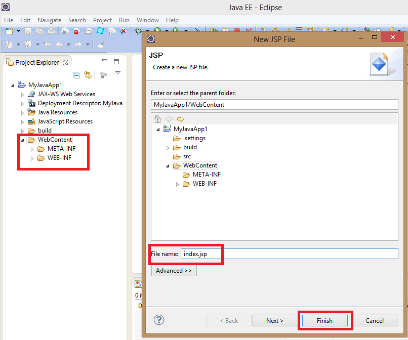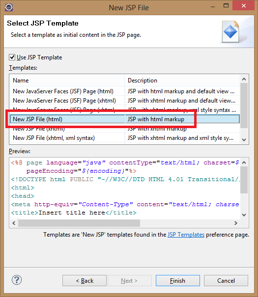 8) Añadimos un fichero JSP de prueba, “index.jsp” (a partir de la plantilla html), dentro de la carpeta “WebContent”:
