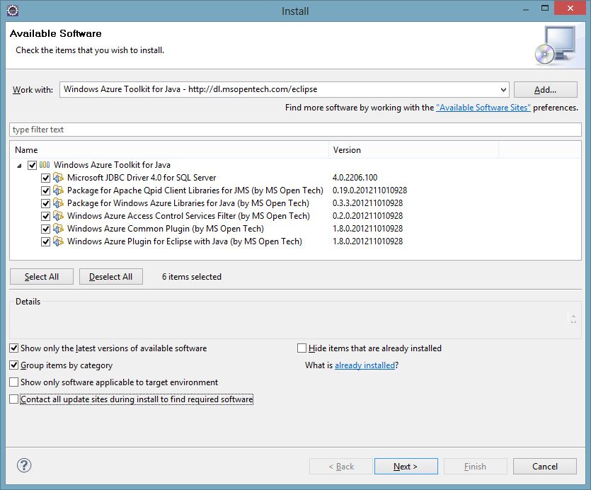 3) Una vez instado Eclipse, instalamos el plugin para Windows Azure siguiendo los siguientes pasos e incluyendo este enlace: http://dl.msopentech.com/eclipse, en el campo “Work with:”