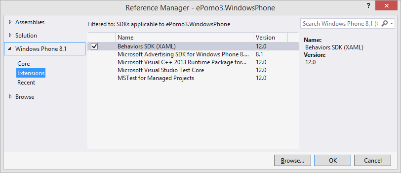- Añadir la referencia a la DLL “Behaviors SDK (XAML)”. Es importante incluir ésta para poder hacer uso de triggers (“<i:Interaction.Behaviors>”) desde el XAML y vincular así cada View con su ViewModel.