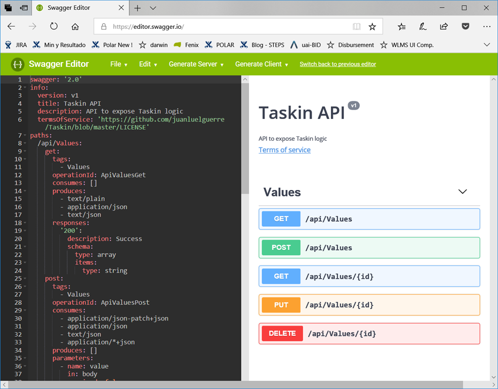 Nota: En esta URL: https://app.swaggerhub.com/apis/juanluelguerre/Taskin/v1, he publicado la versión 1.0 (muy sencilla) de Taskin, sobre la que podremos probar.