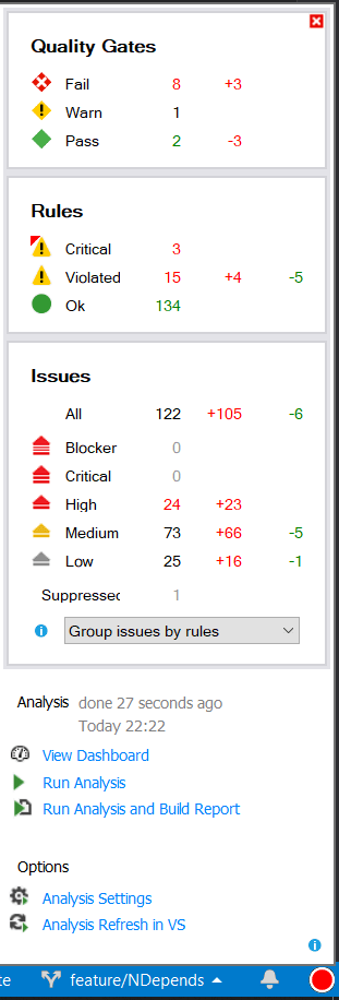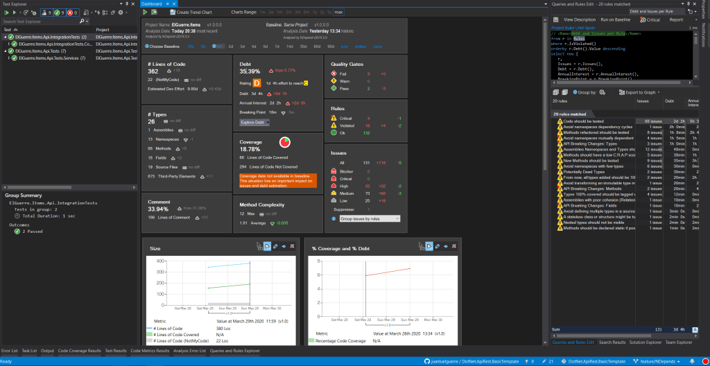 NDepend es la única extensión de Visual Studio que puede decirnos que durante la última hora, el código recién escrito ha introducido una deuda técnica que costaría, por ejemplo, de 30 minutos. Sabiendo esto, podemos arreglar el código, incluso antes de comprometerlo con el control de código fuente.