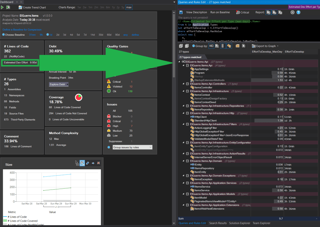 En lo que respecta, por ejemplo, a la deuda técnica, podemos verla detallada por método e incluso acceder y/o modificar el código «Linq» equivalente.