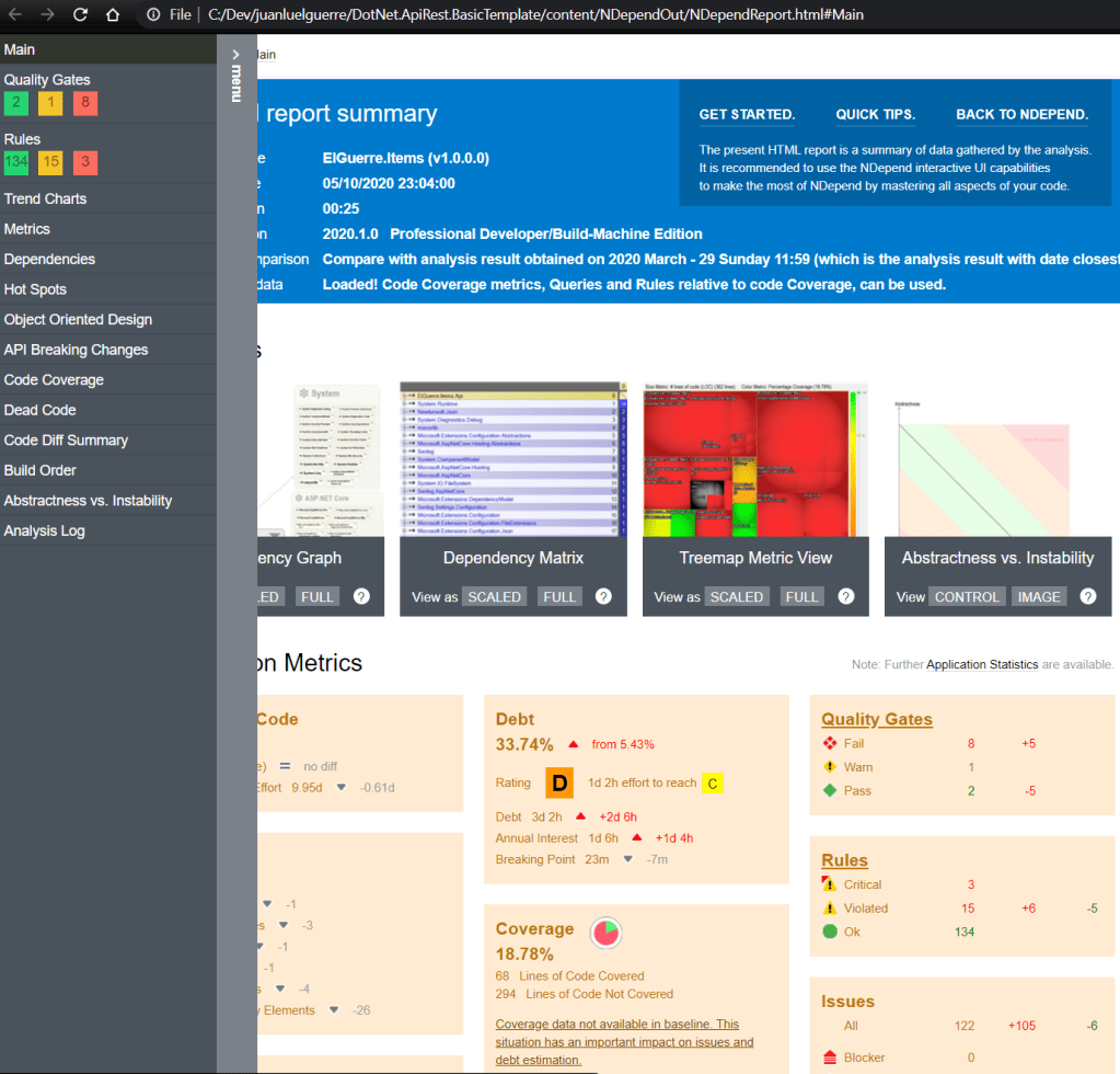 Que también cuenta con una opción «Run Analysis and Build Report«, que, además de mostrar el Dashboard, como hemos visto anteriormente, genera un report local (en formato html), totalmente navegable y accesible a todos los detalles. Como podemos imaginar, su consumo, va a permitirnos no depender directamente de Visual Studio.