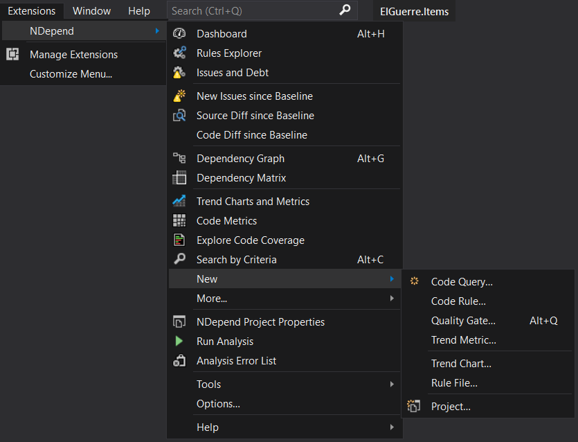 Asi mismo, para nuevas personalizaciones tenemos varias alternativas mediante el menu: «Tools – NDepend – new« y sub-menu: Code query… | Code Rule… \ Quality Gate… | Tend Metric…\ Trend Chart… \ Rule File… \ Project …«.