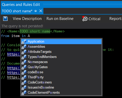 Uno de los puntos interesantes es la facilidad para hacer consultas sobre el código o incluso definir nuevas reglas, usando un lenguaje muy similar a «Linq» . Para ello bastará con editar las mismas o bien crear una nueva.