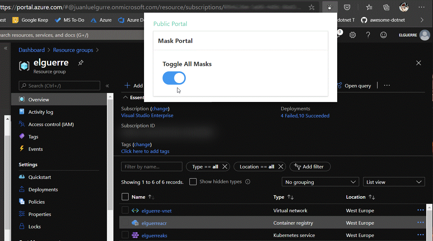 Azure Mask (Az Mask). Es una extensión de Chrome / Edge (Chromium) que permite enmascarara (o hacer «blur«) de todas los textos de caracter sensible al navegar a lo largo del Portal de Azure.