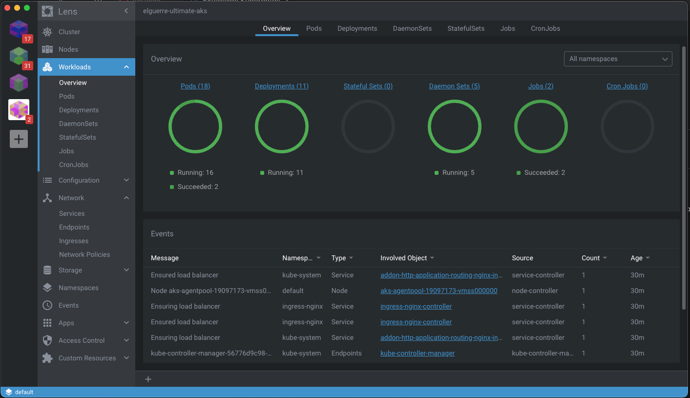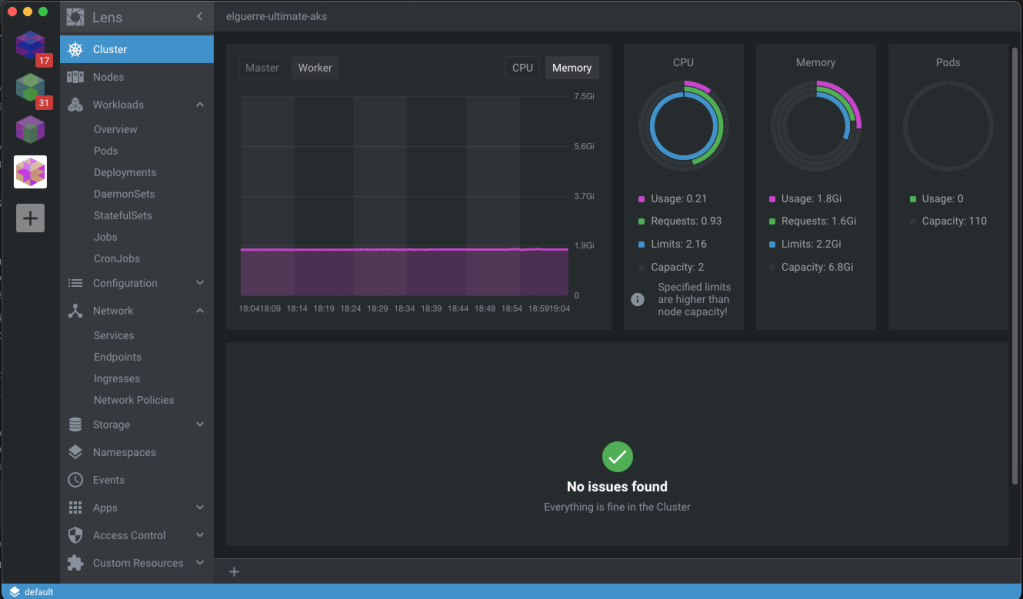 En la siguiente imagen podemos ver una imagen de LENS, y en concreto, la opción de «Overview» del Cluster. Vemos también acceso directo a los Pods, Deployments, etc. y la posibilidad de realizar acciones, como eliminar, editar y escalar. ¡En mi opinión, creo que no tardará en disponer de la realización de todas estas acciones de manera masiva, lo que la hará mucho mas y útil 🙂!