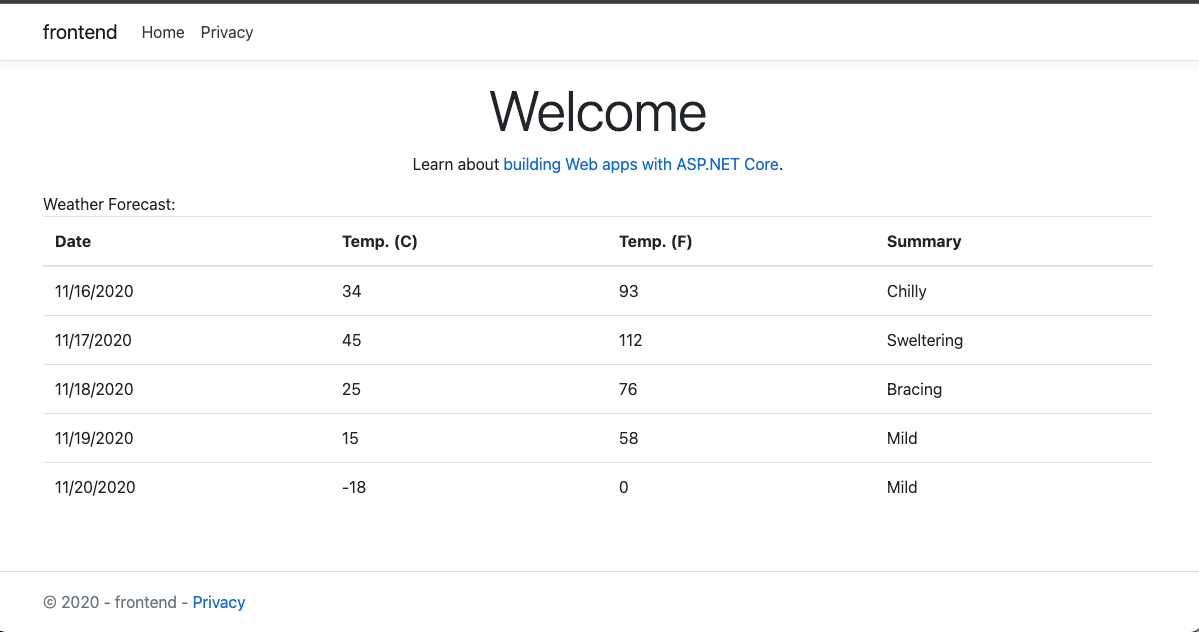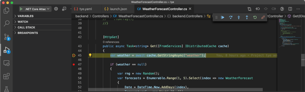 Como podremos observar en el código, para la comunicación entre frontend y backend no se especifica la ruta base, ni mucho menos se utiliza hardcode, en su lugar, se especifica el nombre del backend y el Service Discovery de Tye se encarga del resto. Para usarlo, bastará con añadir a nuestro proyecto la referencia al paquete nuget: «Microsoft.Tye.Extensions.Configuration«. ¡Si quieres profundizar sobre ello, visita este link!.