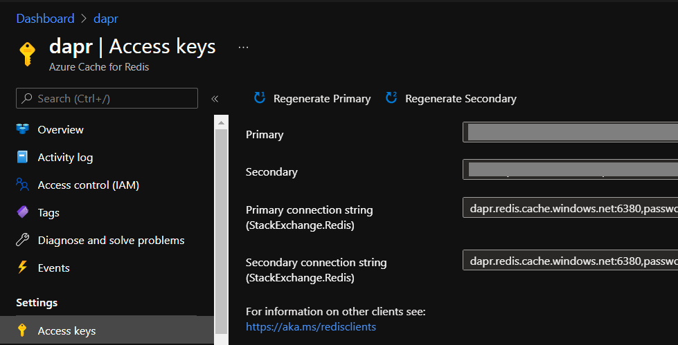 En primer lugar creamos en Azure un nuevo recurso «Azure Cache for Redis». En este caso con el nombre «dapr», y navegamos a la opción «Access keys», donde otenemos la clave para nuestro Redis.