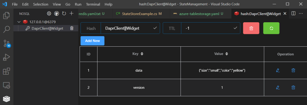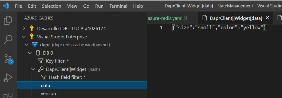 Si a continuación usamos un cliente (este, por ejemplo) para ver la información almacenada localmente en Dapr Redis, este será el resultado: