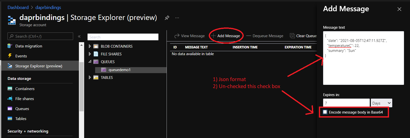 Desde el Azure Storate Explorer en el portal de Azure, o bien usando la aplicación de escritorio Azure Storage Explorer, añadimos un nuevo mensaje a la cola.