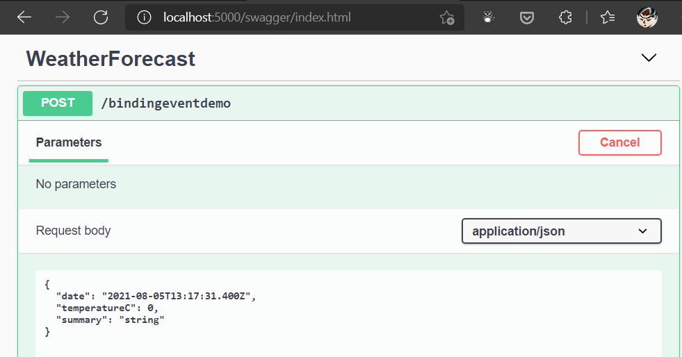 Para la ejecución de bindings de salida (o output binding), basta con enviar un mensaje, utilizando para ello el método InvokeBindingAsyc de una instancia DaprClient. Para nuestro ejemplo, el valor del «Binding Name» ha de coincidir, y, por tanto, tiene que tener el valor «bindingeventdemo«.