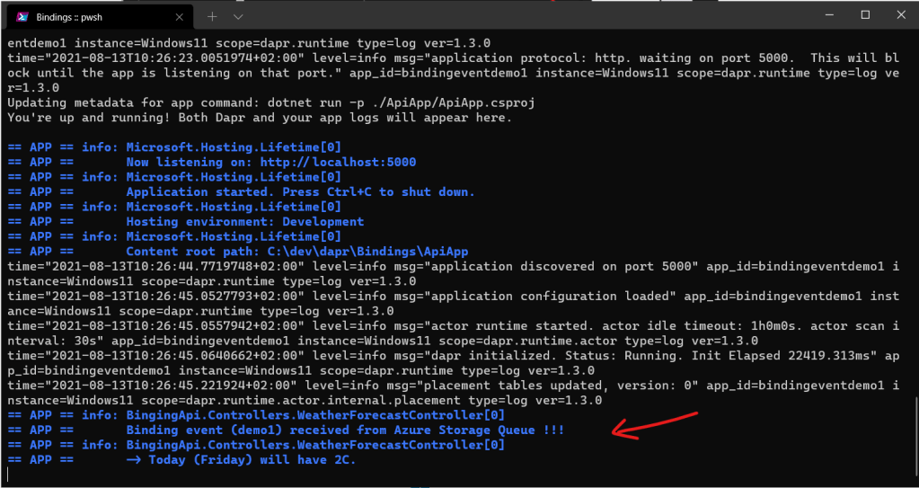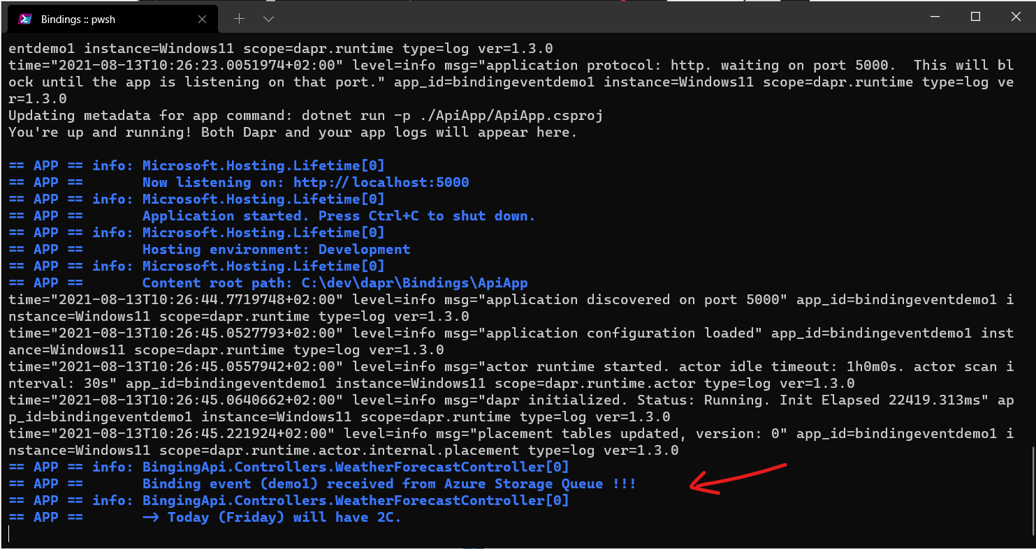 dapr run --app-id bindingeventdemo1 --app-port 5000 --dapr-http-port 3500 --dapr-grpc-port 50000 --components-path ./dapr/components -- dotnet run -p ./ApiApp/ApiApp.csproj