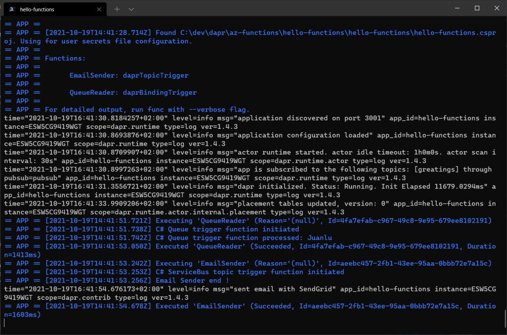 dapr run --app-id hello-functions --dapr-http-port 3501 -p 3001 --components-path .\dapr\components -- func host start