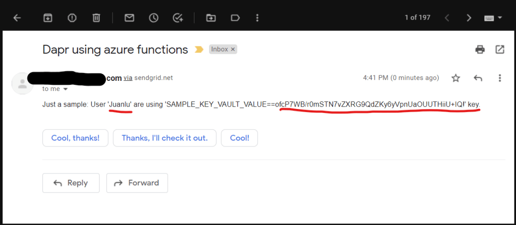 - DaprBinding. Utiliza el componente Dapr mail (mail.yaml), que a su vez hace uso del secreto sendgridKey (de Key Vault), para obtener el ApiKey de SendGrid y hacer el envío del email, a la dirección de email configurada también en dicho componente.