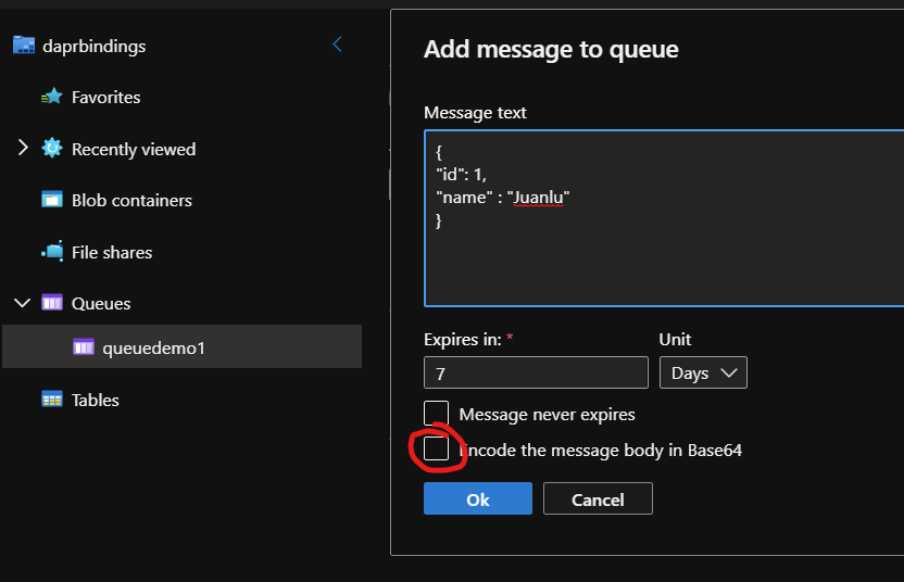 - En primer lugar, DaprBindingTrigger, permanece escuchando en la cola para leer cualquier mensaje que depositemos en la misma.