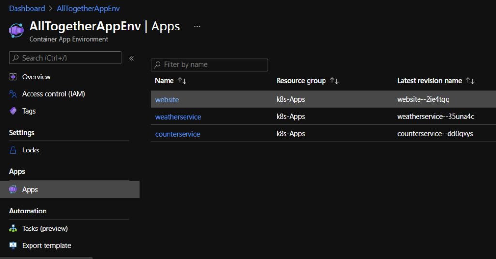 El scripts PowerShell completo lo tenemos aquí en el repositorio github de la aplicación: AllTogetherApp – deploy – AzureContainerApps – Deploy-AzureContainerApps.ps1. Tras su ejecución, vemos como los tres Container Apps se han creado.