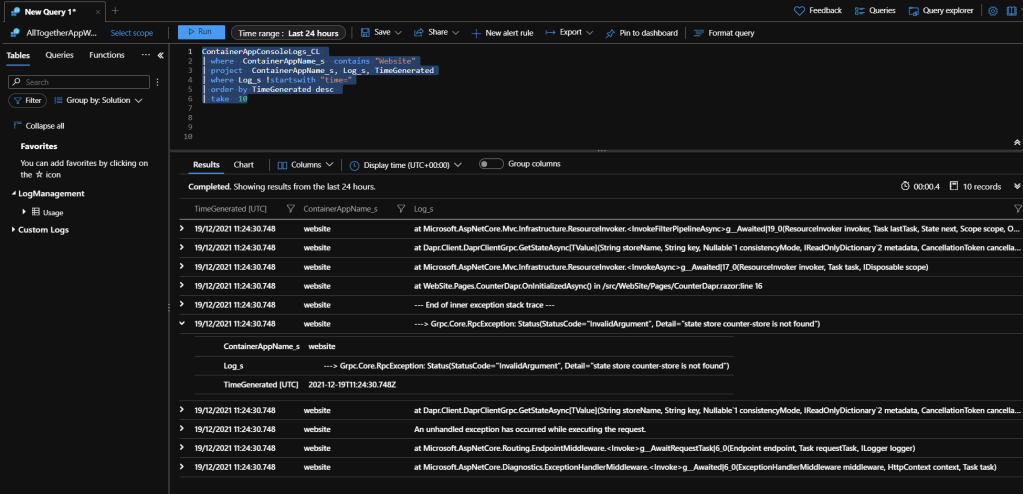 Si tenemos errores, es aquí donde entra en juego el Log Analytics antes creado. Por tanto, basta con ejectuar una consulta similar a la siguiente para encontralos.