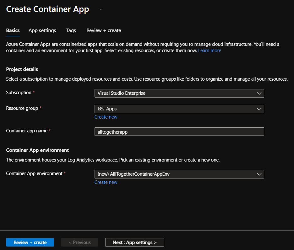 Pulsamos el link «Create new» vinculado al campo «Container App environtment» y completamos la información solictada.