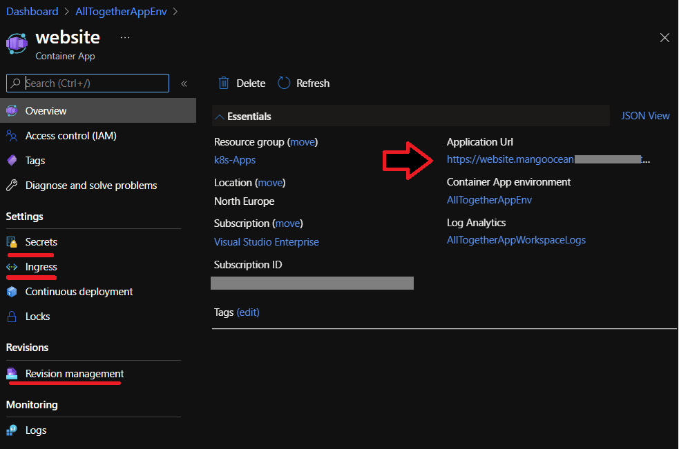 Si accedemos al «website» tenemos todo el detalle del mismo: Secrets, Ingress e incluso en «Revision management» información de escalado y mas detalle sobre Dapr.