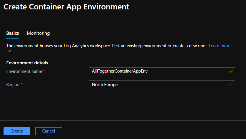 Pulsamos el link «Create new» vinculado al campo «Container App environtment» y completamos la información solictada.
