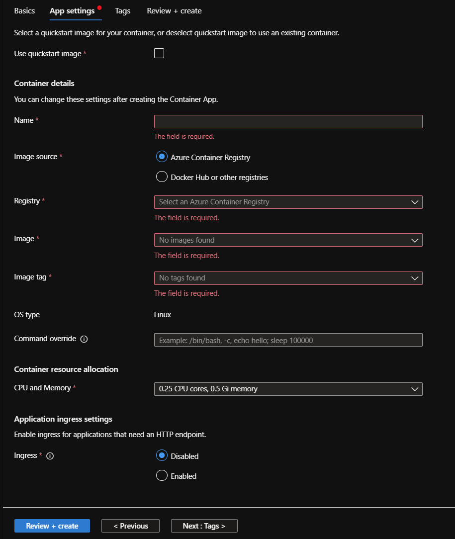 Para finalizar seleccionamos la pestaña «App settings», donde temos la posibilidad de ajustar los valores para nuestro Container App. Desde el origen de las imágenes docker hasta hasta los recursos para la ejecución de dicha imagen, que contiene la aplicación/servicio/proceso y un ingres.