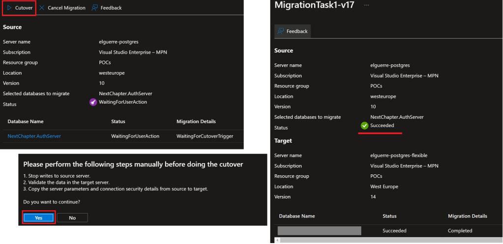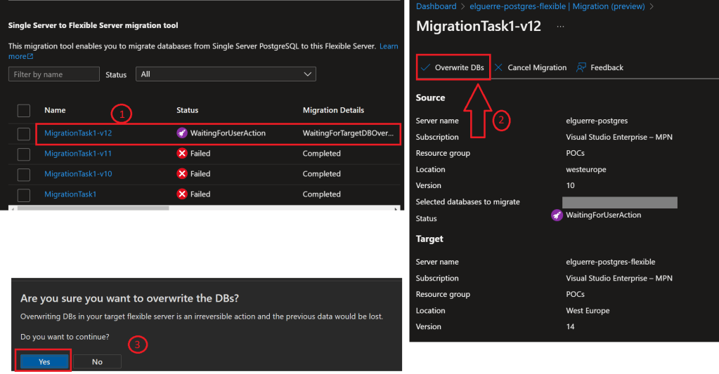 Adicionalmente, podemos encontrarnos con un sub-estado: «WaitingForTargetDBOverwriteConfirmation«, el cual requiere confirmación para sobre-escribir los cambios en el destino. Esto ocurrirá si hemos tenido que repetir por algún motivo un proceso de migración.
