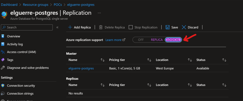 2. Establecer como «LOGICAL» el modo de replicación en el servidor origen (Single Server).