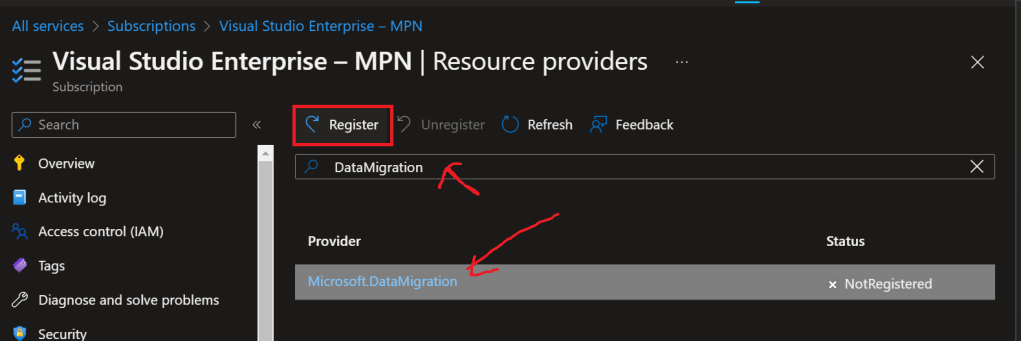 1. Registrar el proveedor de recursos (o Resource Provider) «Microsoft.DataMigration».