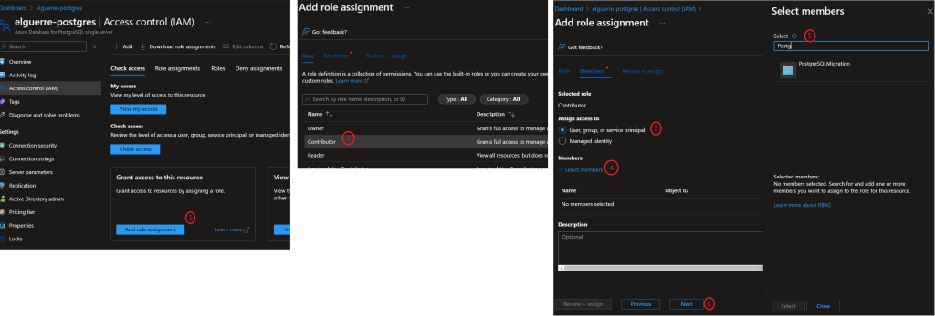 4. Asignar permisos de Contributor al Servidor Postres de origen (Single Server) para el AppRegistration creado en el paso anterior.