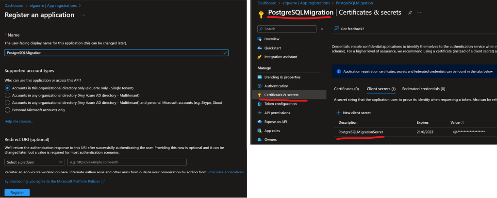 3. Crear un nuevo AppRegistration en AAD con el nombre, por ejemplo: «PostgreSQLMigration»