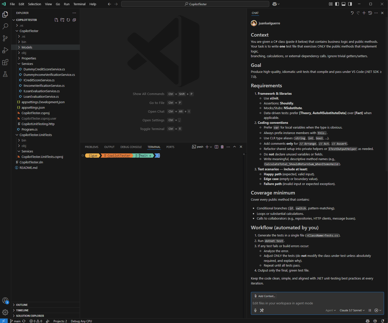 To showcase how this works in practice, I created a realistic .NET 9 Minimal API called CopilotTester with a LoanEvaluationService that contains business logic for evaluating loan applications. This scenario includes various conditions and rules that make it perfect for writing thorough unit tests.